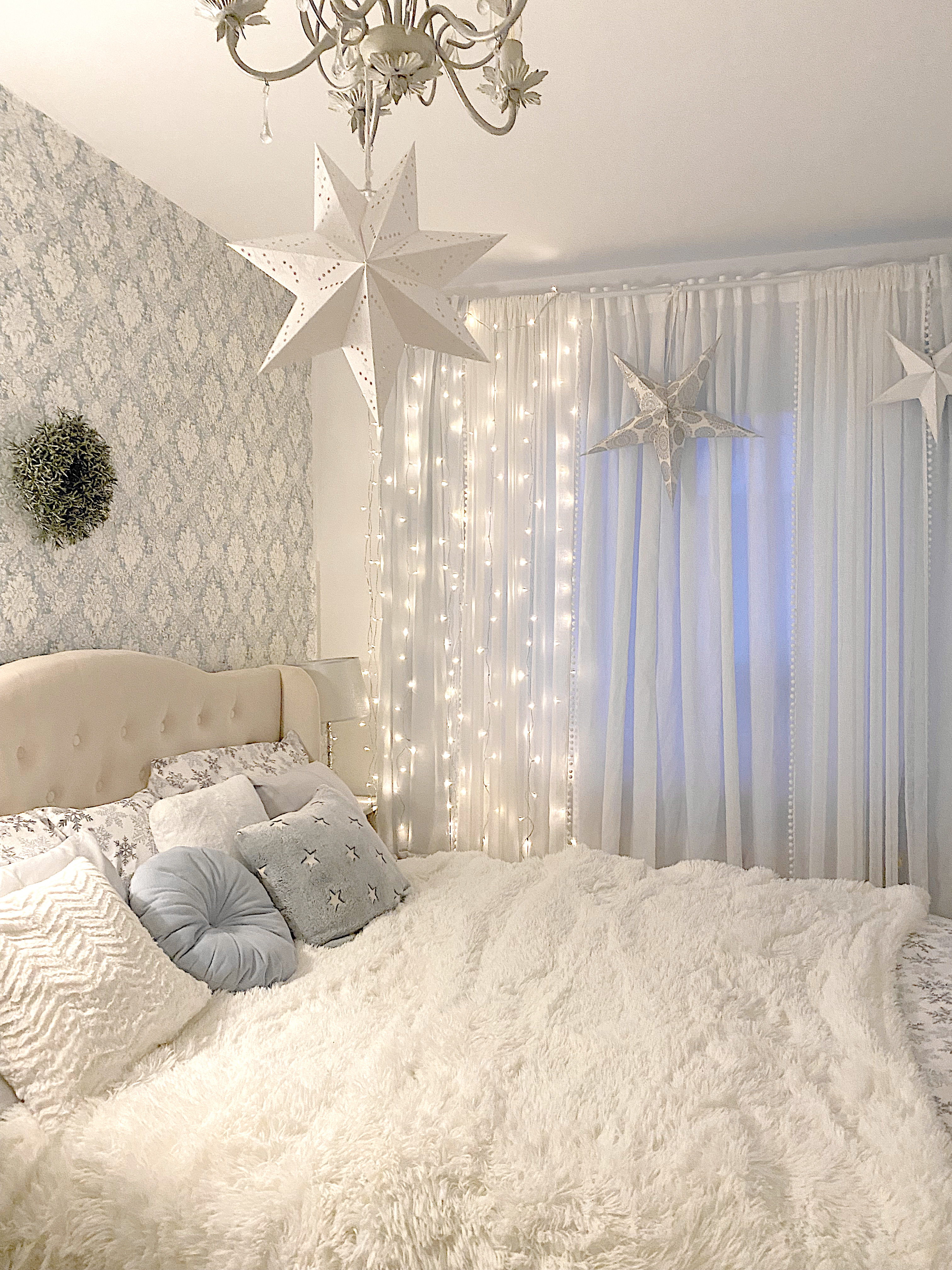 I na koniec mały akcent świąteczny z sypialni. Nie chciałam zagracać tutaj dekoracjami świątecznymi, ozdobami, dlatego wykorzystałam tylko papierowe gwiazdy i wianek. Reszta to światełka i tekstylia, które podkręcają klimat. Zaszycie się w tym pokoju pod kocem z książką i herbatą i zamknięcie za sobą drzwi, chociaż na chwilę, to dla mnie luksus;) Dobrze mieć taką miejscówkę na wypoczynek:)