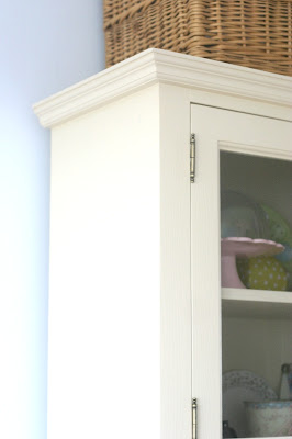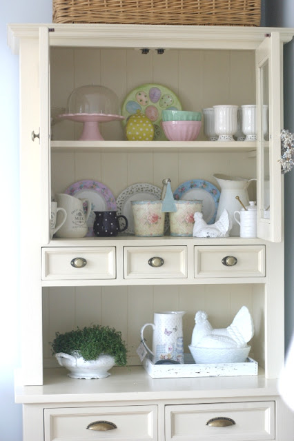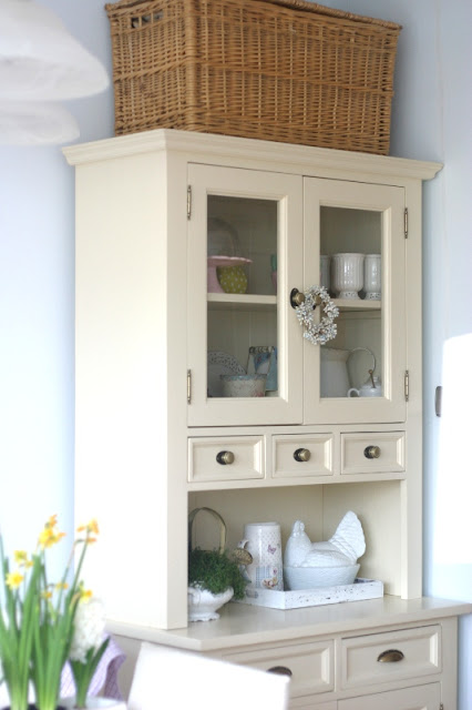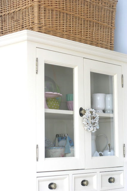 Na górze postawiłam kosz wiklinowy, który podkręca wiejski klimat kredensu.