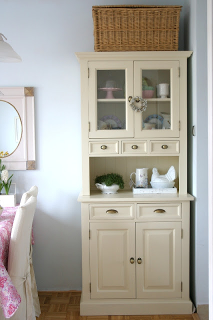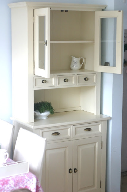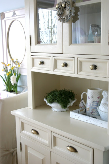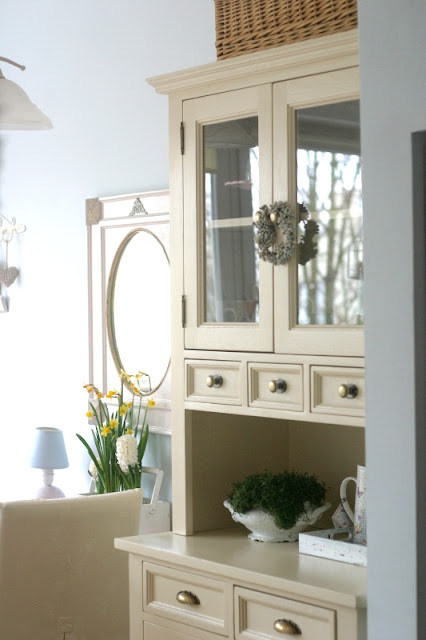 Na tym zdjęciu dobrze widać, że kredens nie jest biały, tylko kremowy, ale taki bardzo mi się podoba. Ten odcień jest bardzo przyjemny dla oka i taki ciepły, więc może zdecyduję się za jakiś czas odświeżyć malowane meble również tym odcieniem.