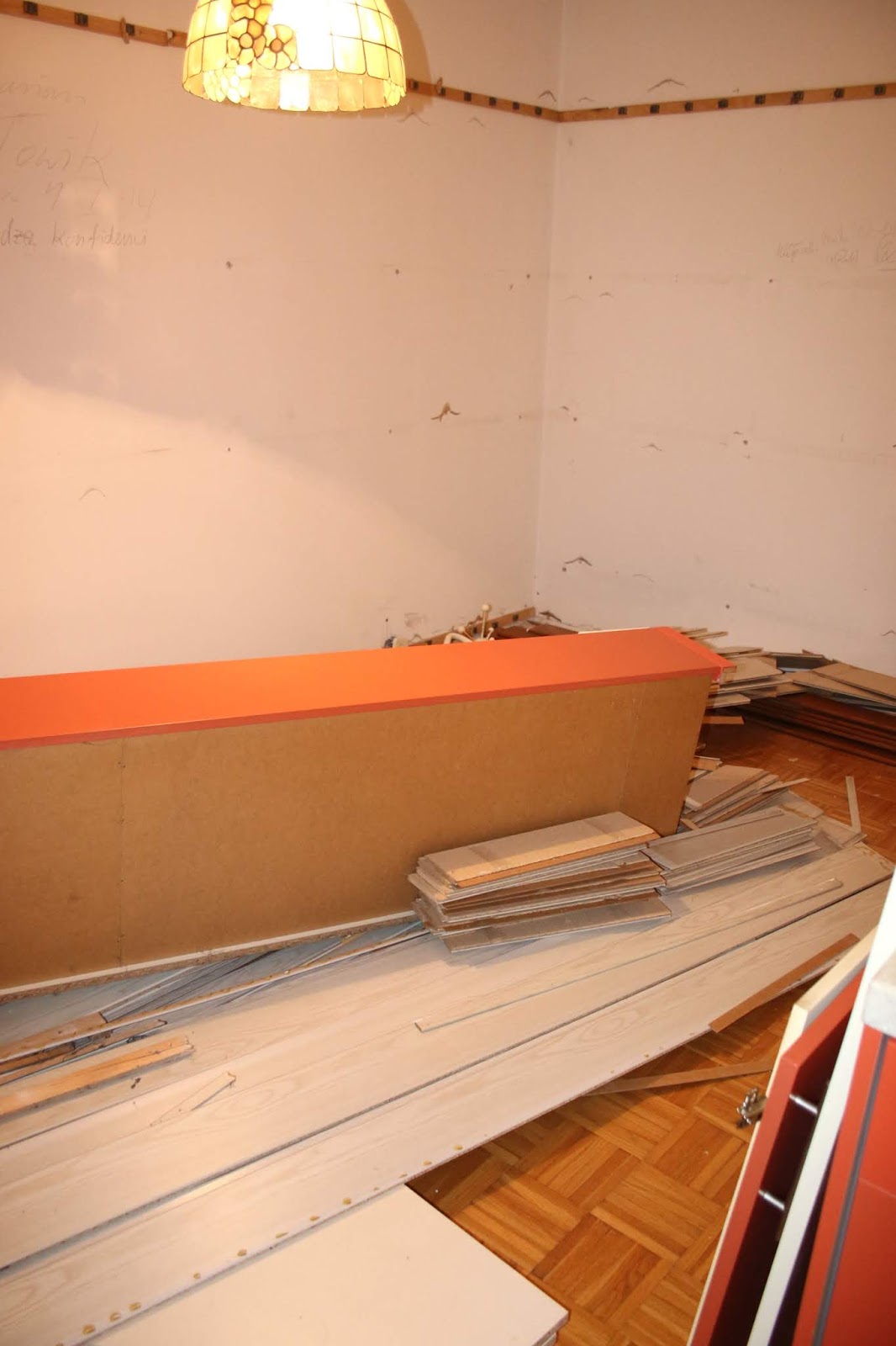 No i po weekendowej demolce - udało się nam zerwać panele z całego pokoju i większości przedpokoju. Zdemontowaliśmy też część mebli kuchennych, sprzęt agd, mnóstwo listew, listewek, kątowniczków...